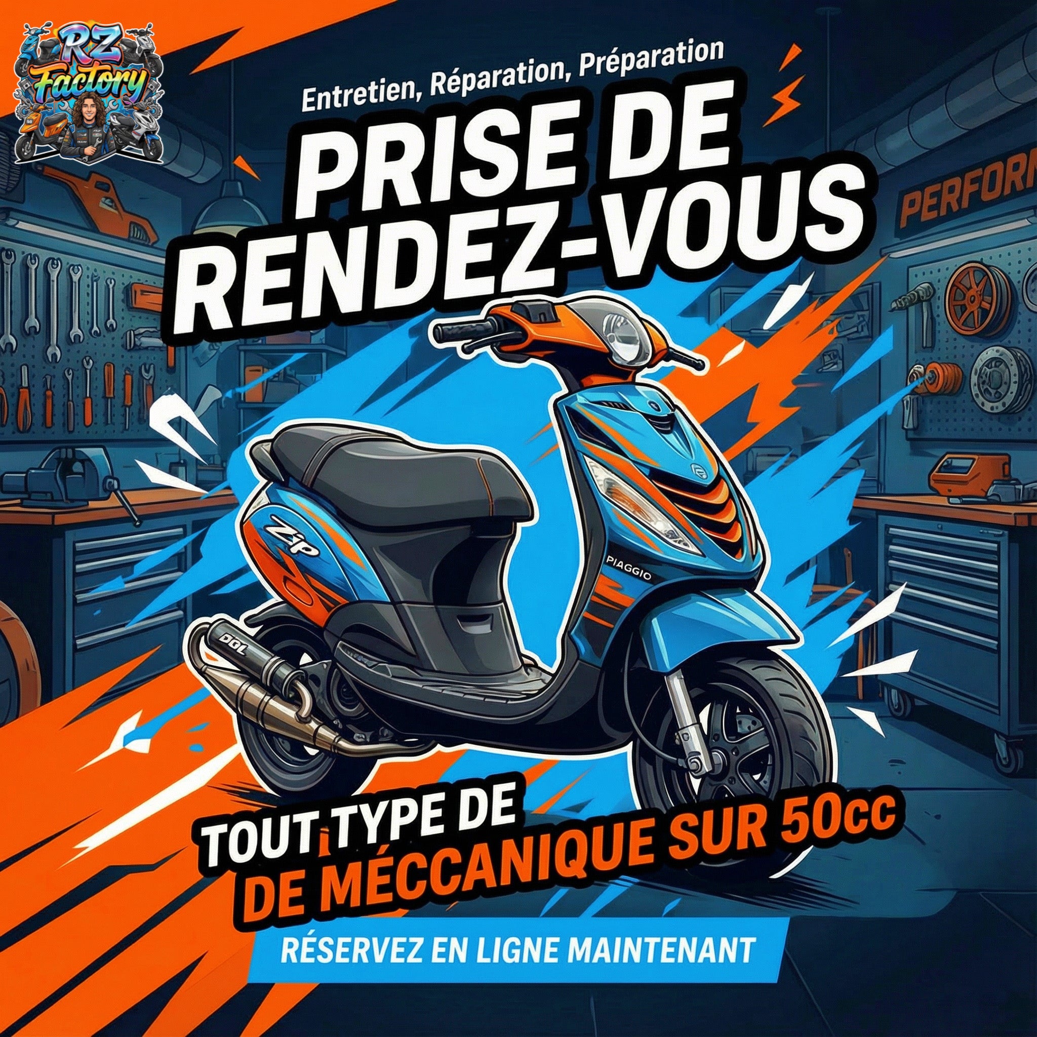 Chez RZ Factory, nous prenons en charge tous types de services mécaniques pour scooters et 50cc, du simple entretien à la préparation complète.